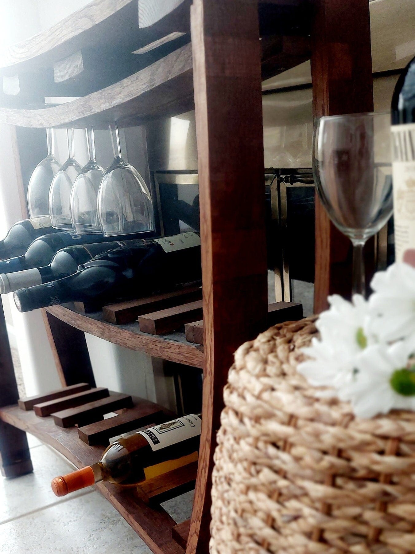 Reclaimed Wine Barrel Rack with Glass Holder – Handmade Rustic Luxury Wine Rack for Homes with Taste